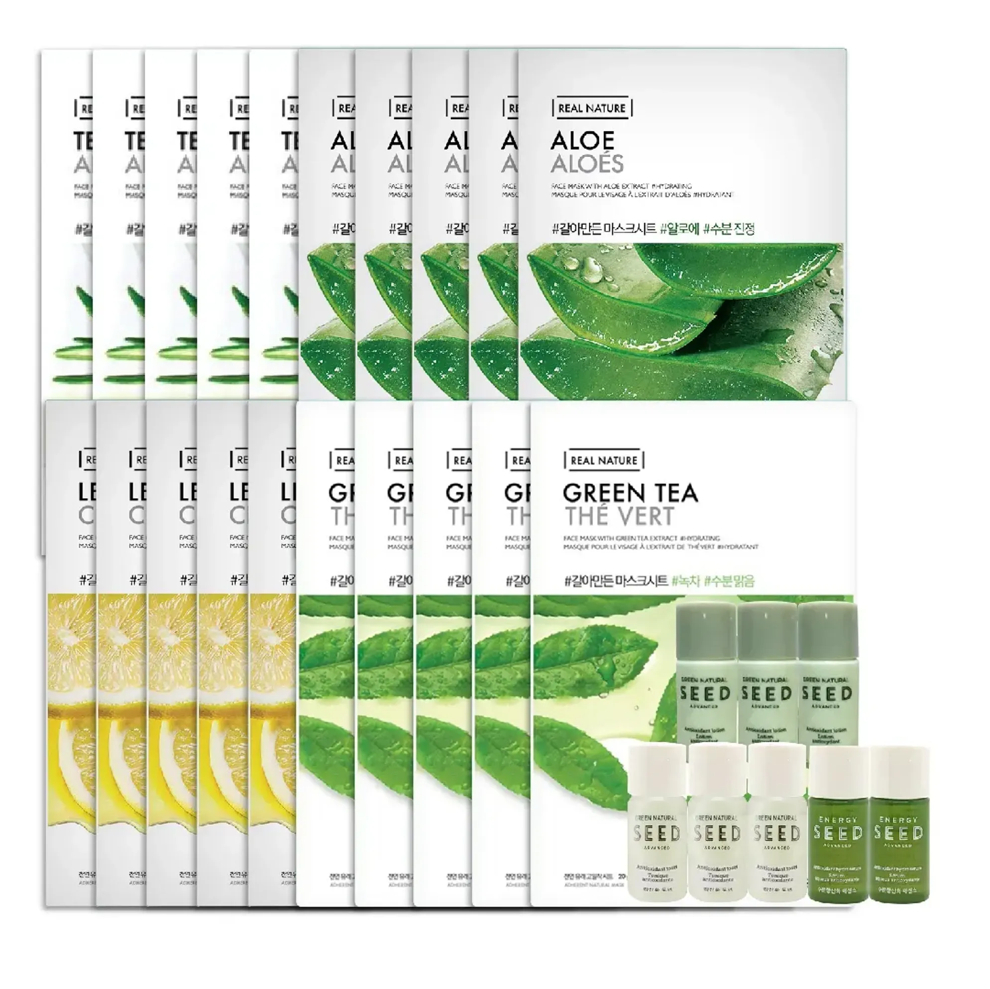 Combo Mặt Nạ Mix REAL NATURE & Bộ Dưỡng Da GREEN NATURAL SEED (5 tràm trà, 5 lô hội, 5 chanh, 5 trà xanh, 3 sữa dưỡng, 3 toner, 2 tinh chất)