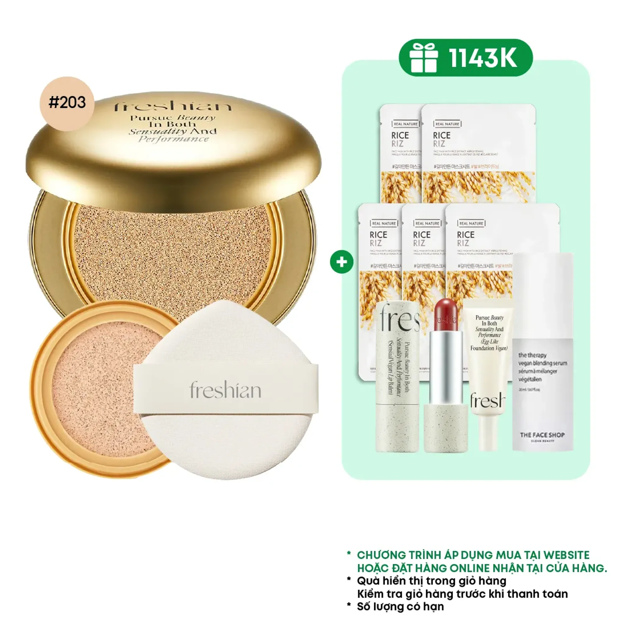 (Tặng kèm lõi)Combo Phấn Nước Freshian Thuần Chay Che Phủ Khuyết Điểm Egg-Like Cover Cushion Vegan Spf50+ Pa++++ 12g màu 203