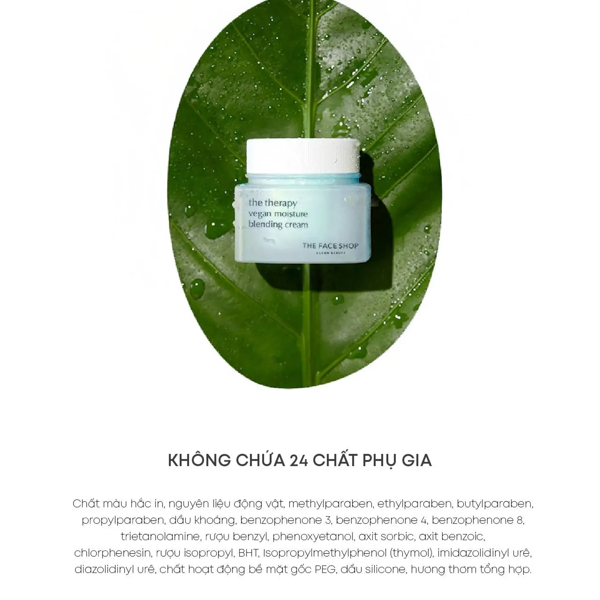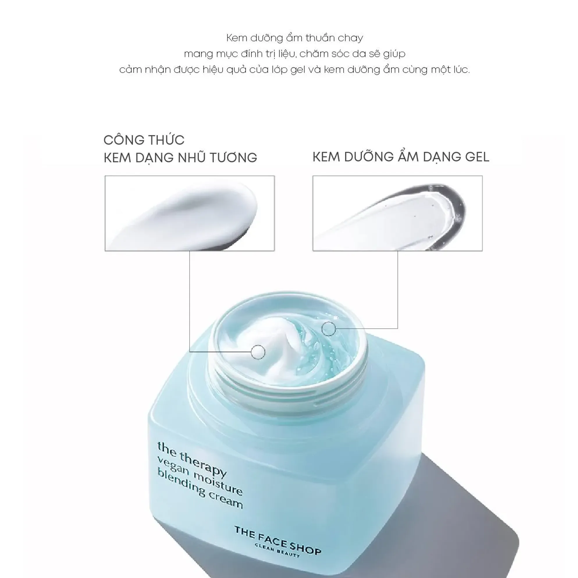 Kem dưỡng ẩm The Therapy Vegan Moisture Blending Cream chứa công thức thuần chay độc quyền gồm các loại thảo mộc hữu cơ được trồng và thu hoạch trên vùng đảo Jeju màu mỡ. Sản phẩm được chia làm hai phần, phần dạng kem và phần gel dạng dầu. Trước khi sử dụng, bạn phải hòa trộn hai phần này với nhau để tạo ra hỗn hợp chuẩn chỉnh đúng với công thức dưỡng ẩm, giảm thiểu lão hóa tuyệt vời mà thương hiệu mang lại.