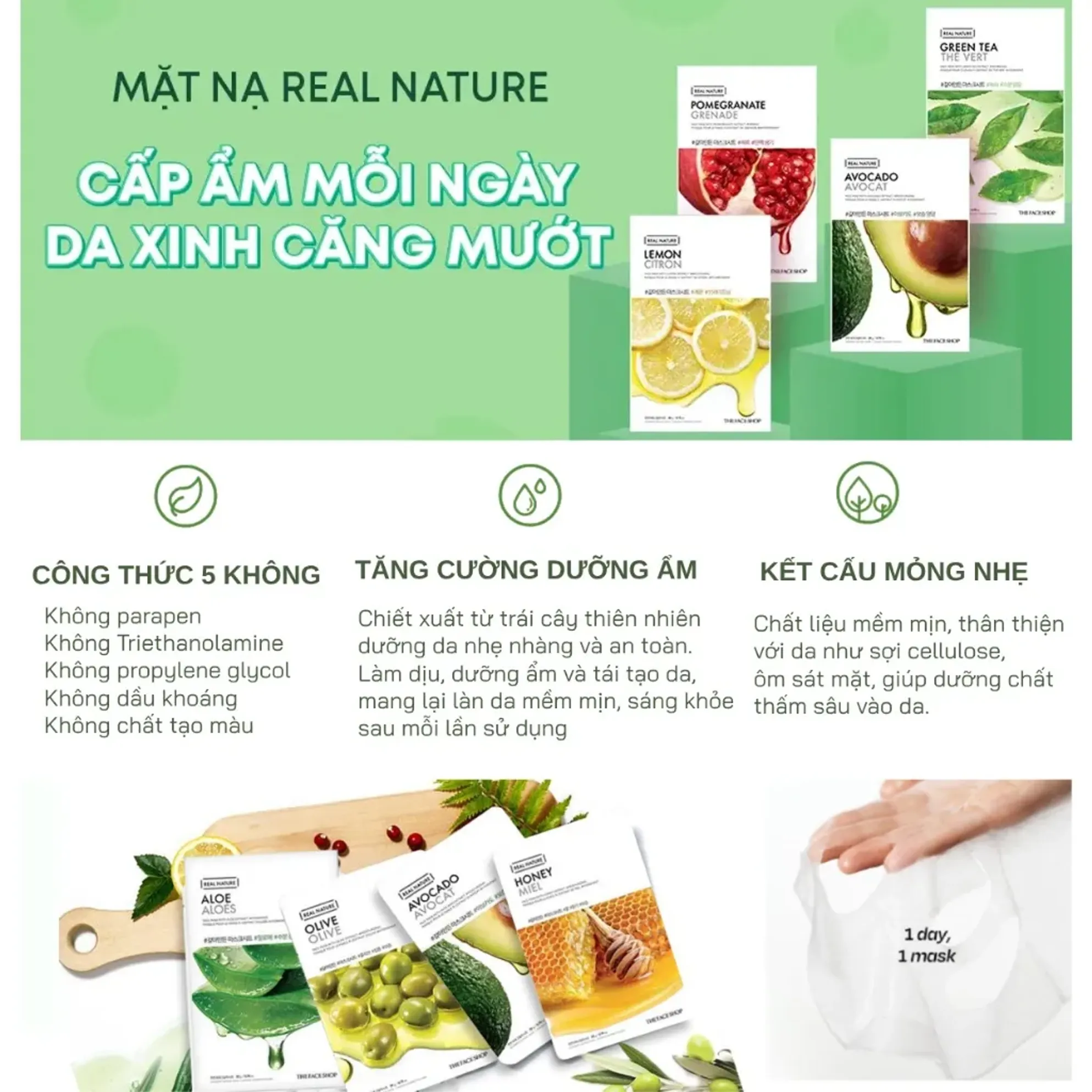 Làn da phải cân bằng độ pH, duy trì màng ẩm lipid khỏe mạnh mới đủ sức chống chọi với các tác động bên ngoài. Và đó cũng là yếu tố căn bản làm nên một làn da khỏe đẹp. Đắp mặt nạ là một trong những bước chăm sóc đặc biệt cho da để bổ sung thêm dinh dưỡng nuôi dưỡng da kéo dài tuổi thanh xuân. Mặt nạ THEFACESHOP là mặt nạ dạng miếng cotton giúp cung cấp nước và làm chậm sự oxy hóa cho làn da.