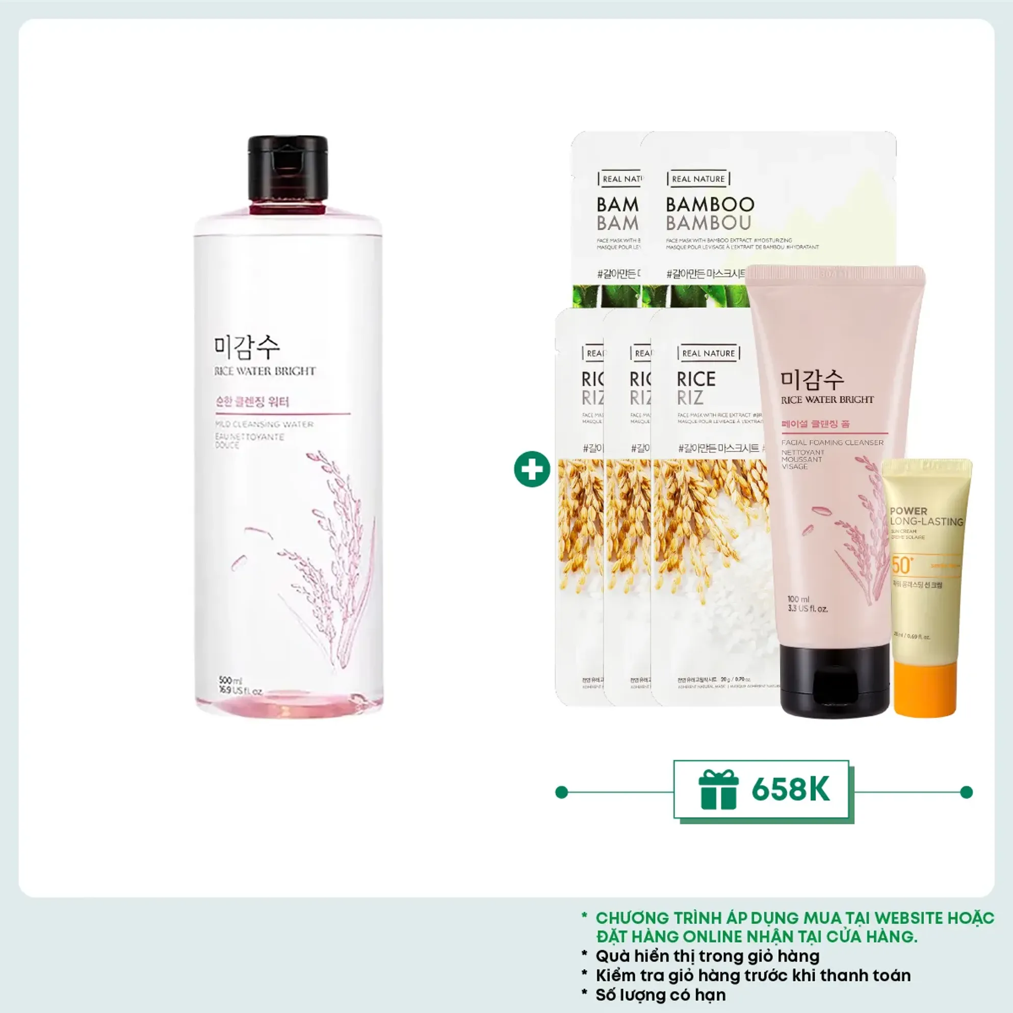 Nước tẩy trang RICE WATER BRIGHT MILD CLEANSING WATER với công thức dịu nhẹ kết hợp với các tinh dầu tự nhiên giúp hòa tan lớp trang điểm, kem chống nắng và bụi bẩn trên da, làm sach nhẹ nhàng, cho người dùng cảm giác dịu êm.