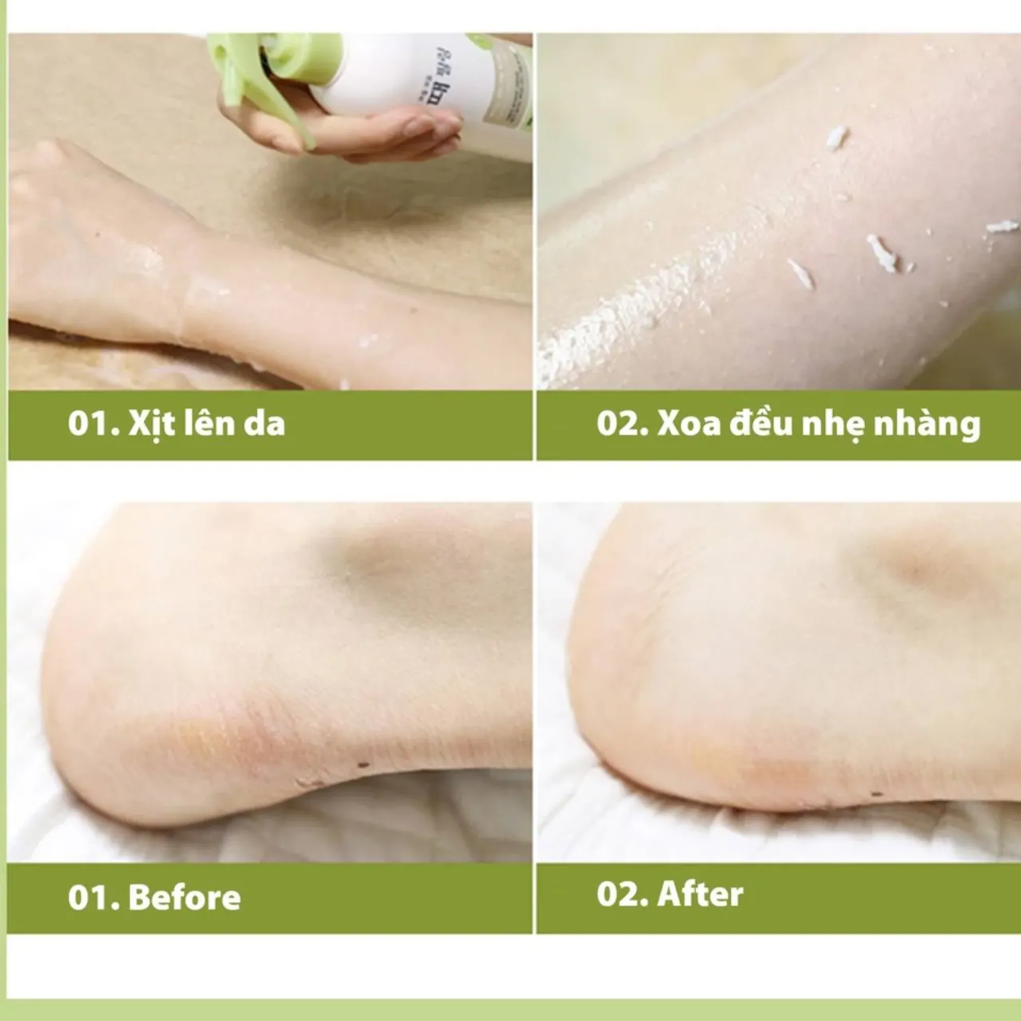 Lắc đều sản phẩm, xịt lên da toàn thân. Massage nhẹ nhàng để loại bỏ tế bào chết cơ thể.
