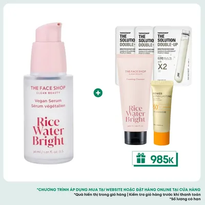 Serum thuần chay Rice Water Bright Vegan của THE FACE SHOP - Dành cho da không đều màu và khô, Hỗ trợ dưỡng đều màu, nuôi dưỡng, cấp nước cho da mặt với thành phần nước gạo, axit hyaluronic, niacinamide. Sản phẩm đã được thử nghiệm lâm sàng cho thấy hiệu quả làm đều màu da.