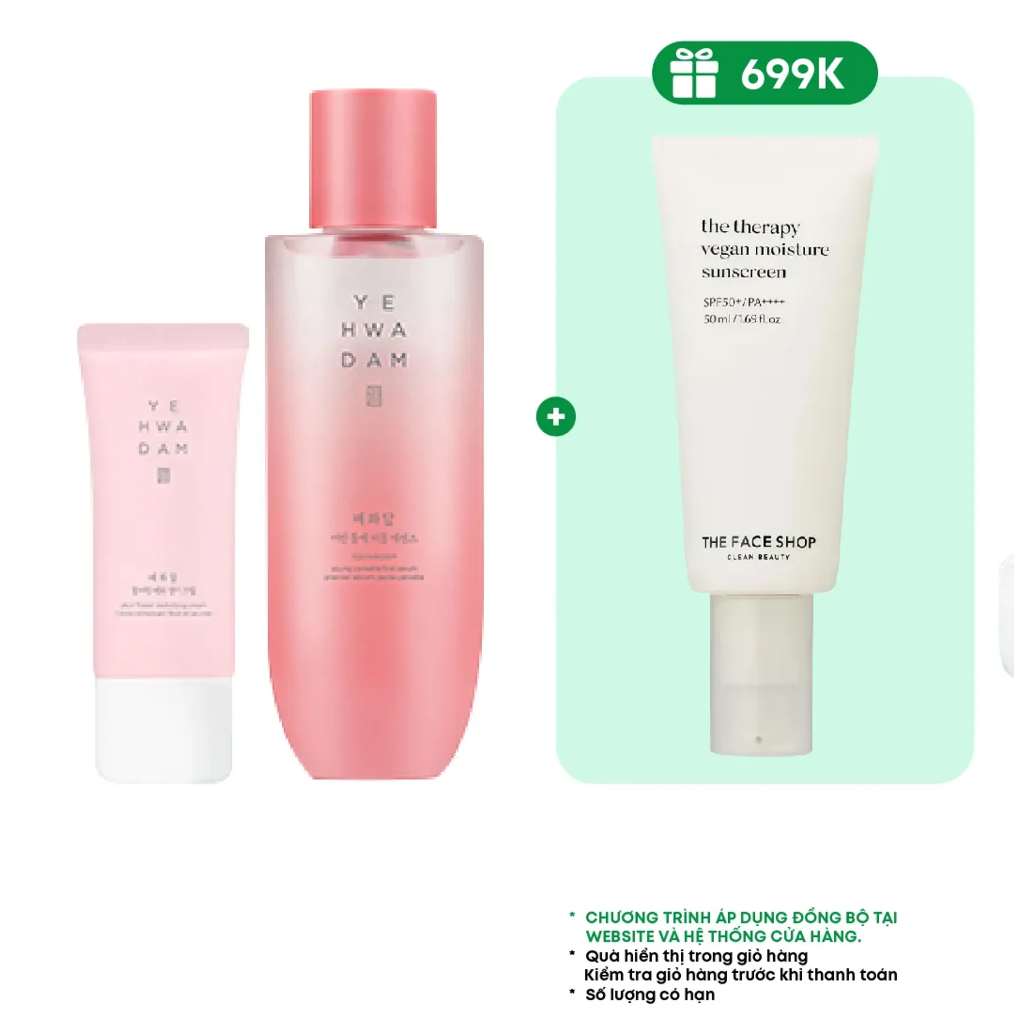 TO22_Bộ Dưỡng Yehwadam Phục Hồi Sáng Hồng Da Young Camellia First 2pcs + Tinh Chất Chống Nắng Ngừa Lão Hóa The Therapy Vegan 50ml